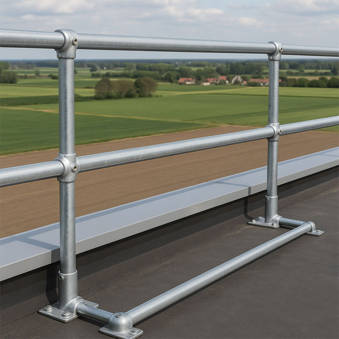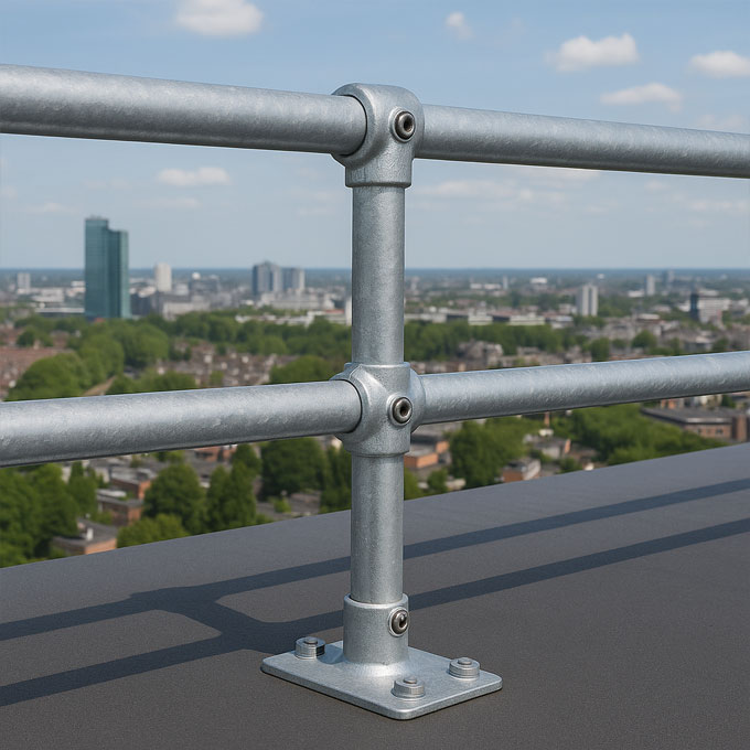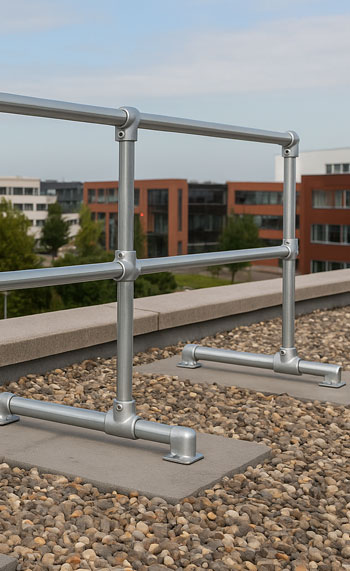 Runde Rohrverbinder bieten gestalterische Freiheit und ermöglichen auch komplexe Schutzsysteme mit nicht-linearen Verläufen. Sie sind ideal für Anwendungen mit besonderen baulichen Anforderungen, wie z. B. geschwungene Dachkanten, individuell geformte Arbeitsplattformen oder temporäre Absperrungen bei Instandhaltungsarbeiten. Durch ihre flexible Verbindungstechnik lassen sich auch ungewöhnliche Grundrisse oder schwer zugängliche Bereiche zuverlässig absichern – schnell, stabil und ohne Spezialwerkzeuge.