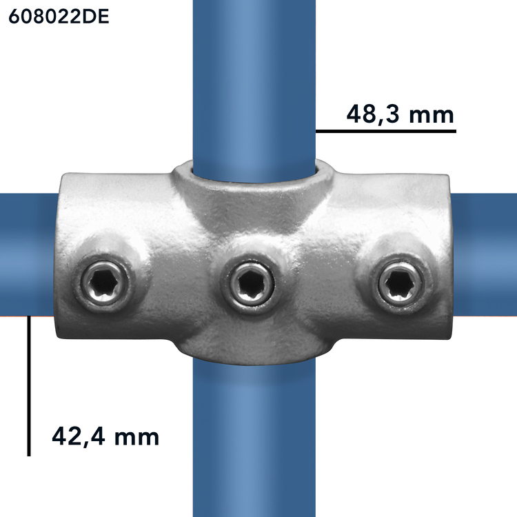 Rohrverbinder T-Verbinder / T-Stück kurz - Typ 2 Der T-Stück-Rohrverbinder Typ 2 dient als 2-Wege-Rohrverbinder für ein horizontales und ein vertikales Rohr. Die waagerechte Rohrverbindung ist nur eine Rohr-Durchführung und kann NICHT als Verbindung für 2 Rohre verwendet werden. Der Rohrverbinder wird außen über die Rohre geschoben und sorgt somit für eine äußere Rohrverbindung. Zur Auswahl stehen Ihnen der T-Stück-Rohrverbinder für die Durchmesser 26,9 mm (3/4"), 33,7 mm (1/2"), 42,4 mm (1 1/4"), 48,3 mm (1 1/2") und 60,3 mm (2"). Das Material des Rohrverbinders Typ 2 ist verzinktes Gusseisen. Vorteile auf einen Blick: Edelstahlschraube Garantie bis 1500 N/m Belastung kein Schweißen, somit keine Feuererlaubnis erforderlich Keine Gewinde, keine Verschraubung Mit einfachem Sechskantschlüssel montierbar Vielseitiges System, vor Ort veränderbar Lackierbar Anwendungen: Handläufe Sicherheitsgeländer/Schutzbarrieren Fallschutz Sonstige Anwendungen für sicheres Arbeiten Feste Geländer Maschinenschutzvorrichtungen Spielplätze T-Verbinder