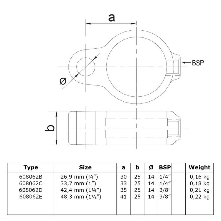 Rohrverbinder Ösenteil mit Doppellasche | Wandbefestigung - Typ 56 Der Rohrverbinder Typ 56 ist ein Ösenteil mit 2 Laschen. Der Rohrverbinder wird außen über die Rohre geschoben und sorgt somit für eine äußere Rohrverbindung. Zur Auswahl stehen Ihnen der Rohrverbinder mit Doppellasche für die Durchmesser 26,9 mm (3/4"), 33,7 mm (1"), 42,4 mm (1 1/4") und 48,3 mm (1 1/2"). Das Material des Rohrverbinders Typ 56 ist verzinktes Gusseisen. Vorteile auf einen Blick: Edelstahlschraube Garantie bis 1500 N/m Belastung kein Schweißen, somit keine Feuererlaubnis erforderlich Keine Gewinde, keine Verschraubung Mit einfachem Sechskantschlüssel montierbar Vielseitiges System, vor Ort veränderbar Lackierbar Anwendungen: Handläufe Sicherheitsgeländer/Schutzbarrieren Fallschutz Sonstige Anwendungen für sicheres Arbeiten Feste Geländer Maschinenschutzvorrichtungen Spielplätze